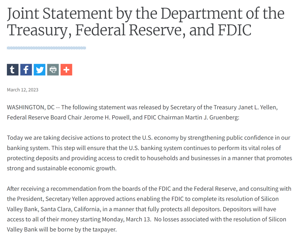 美联储、美国财政部和联邦存款保险公司发布的联合声明 图片来源:美国财政部官网截图