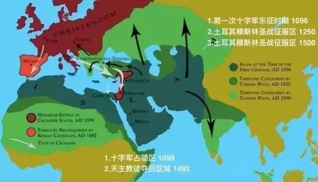 穆罕默德死后不久,伊斯兰的战士们就摧枯拉朽般对基督徒发动了一波又一波的攻势。他们非常成功,巴勒斯坦、叙利亚和埃及--这些曾经是世界上基督徒比例最多的地区--很快被沦陷。到了八世纪的时候,穆斯林军队已经占领了所有北非和西班牙的天主教地区。十一世纪,塞尔柱土耳其人(Seljuk Turks )占领了自从圣保罗时候起就是基督教的区域--小亚细亚( AsiaMinor,也就是现在的土耳其);东罗马帝国--也就是现代历史学家们所称的拜占庭帝国--被削减为比希腊大一点点的小国。情急之下,君士坦丁的皇帝派人向欧洲的基督徒求救,请求他们援助东方的弟兄姊妹。