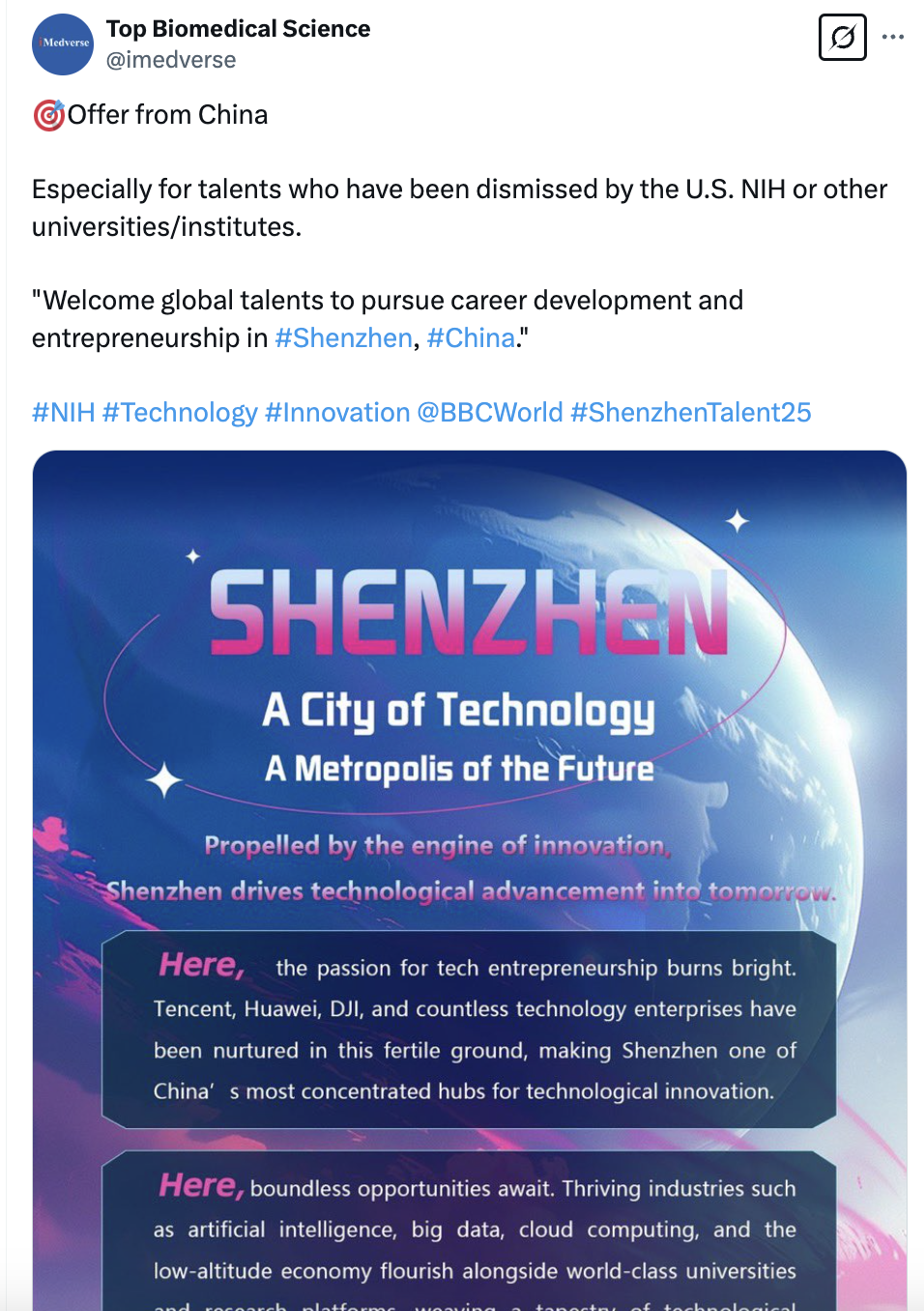最近,深圳的一家科技公司在特朗普政府大闹美国科学界的混乱中发现了机遇。2 月起,他们开始在多个海外社交平台上发布招聘广告,欢迎“全球人才前往深圳就职或创业”。当时,美国疾病控制与预防中心(CDC)、国立卫生研究院(NIH)、国家海洋和大气管理局(NOAA)及国家标准与技术研究院(NIST)等科研机构已有超过 4000 名科研人员被解雇。